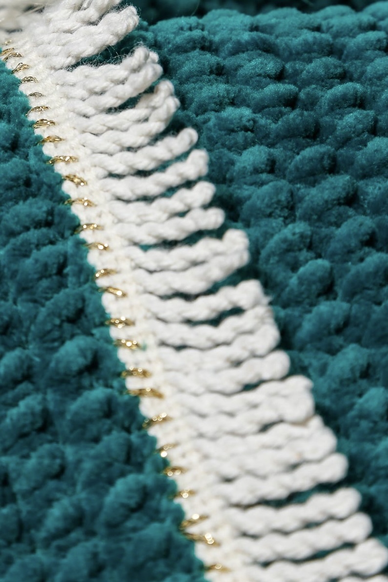 • Op de foto ziet u een stuk franje opgezet met gouddraad, de franje zelf is wit.