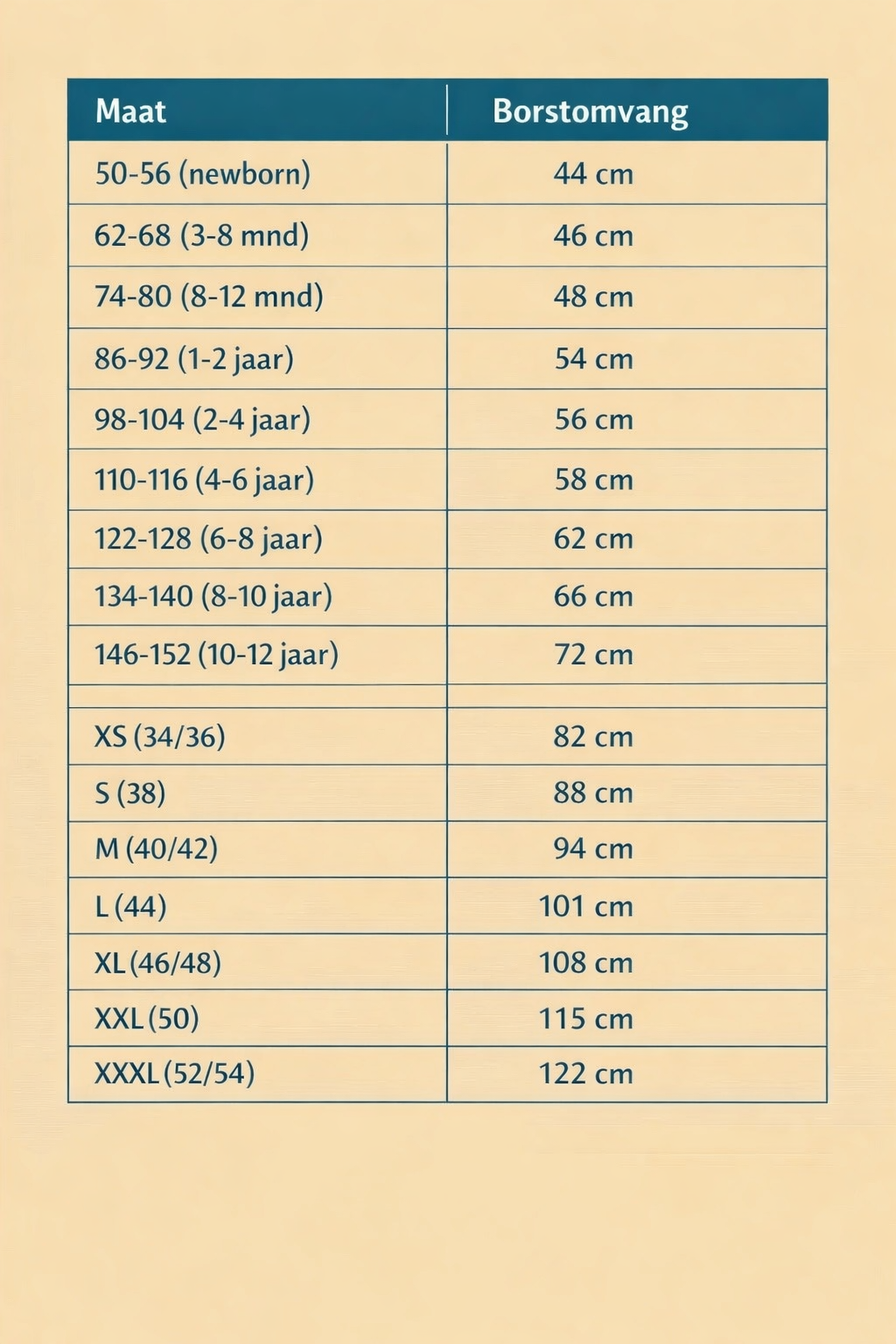 - Maten: 44-92, raadpleeg de maattabel voor de afmetingen.